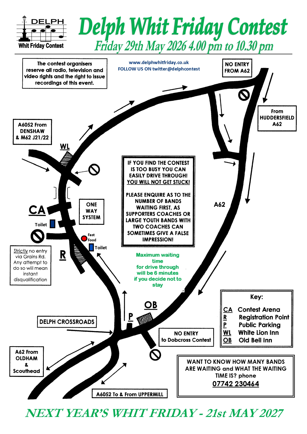 Please follow us on Twitter @delphcontest for a regular update on bands waiting and turn round times.