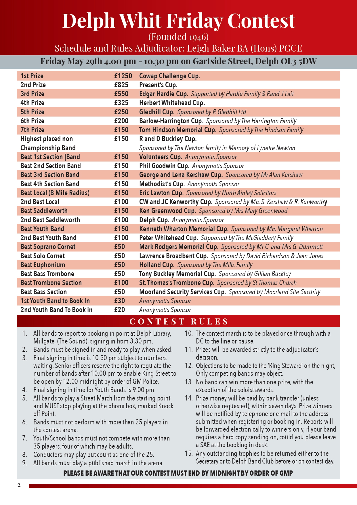 Most importantly please note that King Street (main march down street) MUST be re-opened by midnight by order of Greater Manchester Police. Contest organisers therefore reserve the right to close the booking in early if the number of bands waiting would over-run this timing.